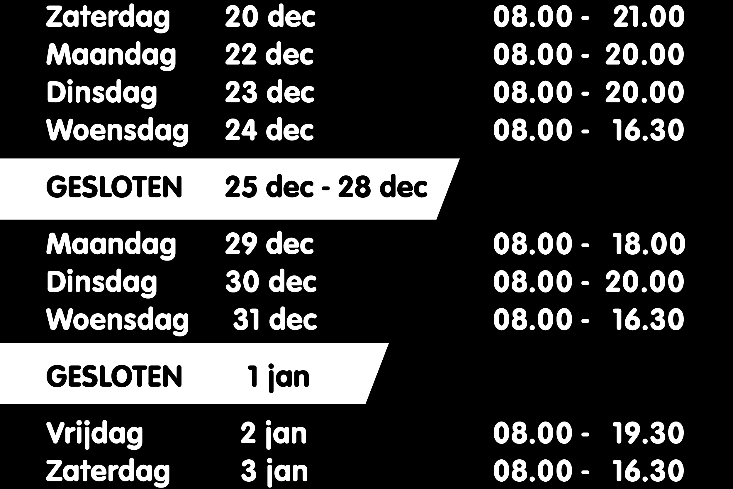 Niet zeker of wij open zijn? Bijvoorbeeld in verband met feestdagen? Geef ons dan een belletje!